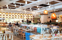 Experience the vibrant spirit of Greek hospitality as a Captain leads you through the signature open seafood market, featuring a meticulously curated variety of fish and seafood flown in from the azure waters of the Mediterranean.